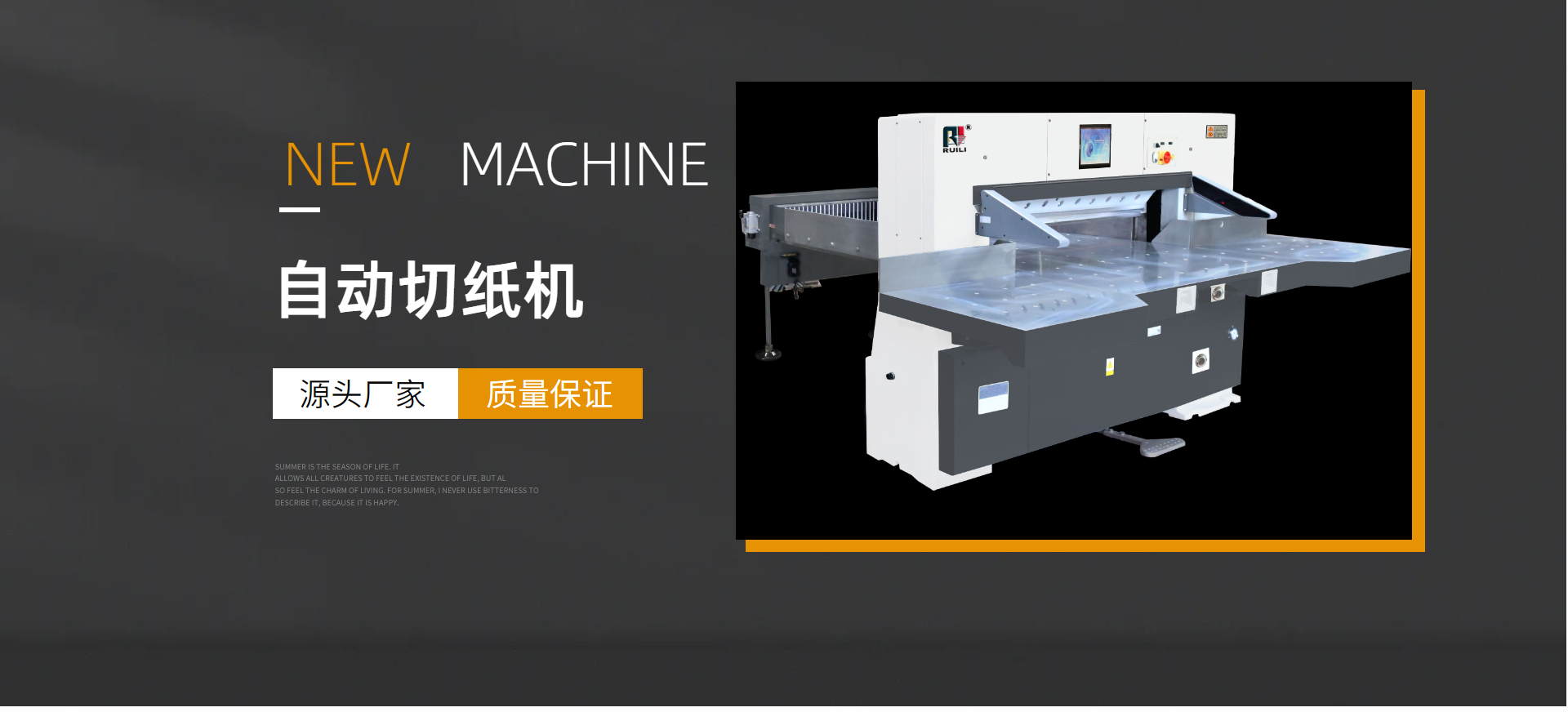 公司主要生產(chǎn):觸摸屏切紙機(jī)、程控切紙機(jī)、液壓數(shù)顯切紙機(jī)系列920、1300、1150、1370、115、1700等切紙機(jī)。公司擁有完整、科學(xué)的質(zhì)量管理體系,機(jī)械加工設(shè)備齊全,工藝設(shè)備完善,且依靠科技進(jìn)步,引進(jìn)高新技術(shù),致力于研究開發(fā)新產(chǎn)品及技術(shù)改造,注重產(chǎn)品售后服務(wù),并吸取德國波拉技術(shù),使企業(yè)得到飛速發(fā)展。